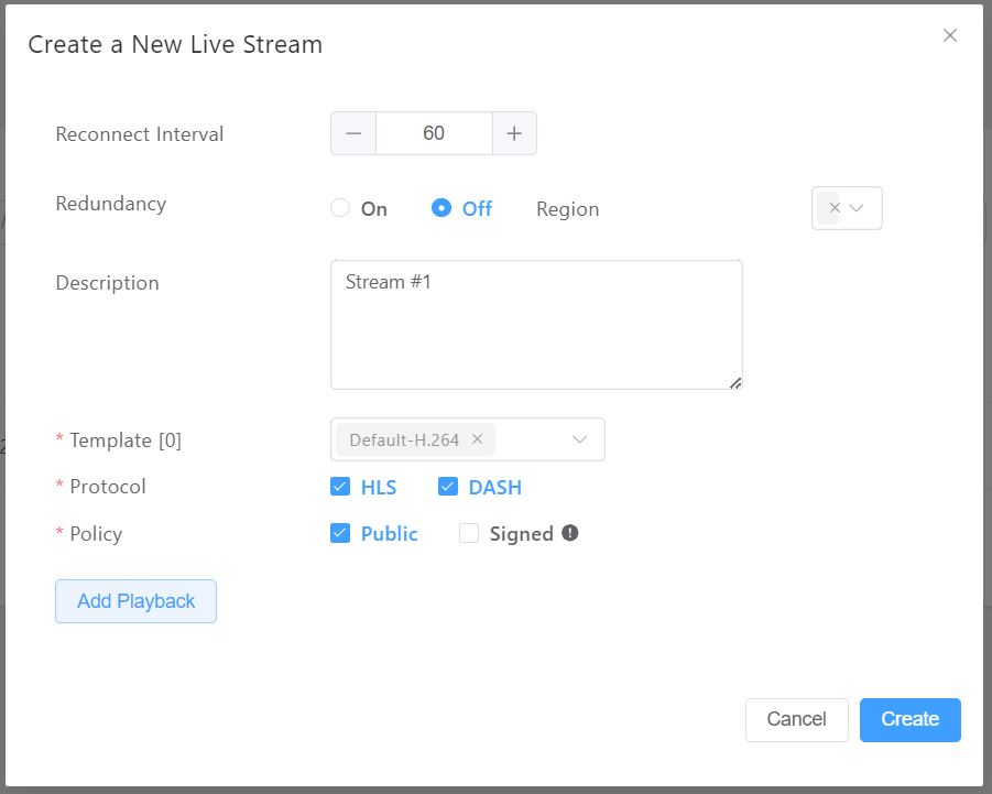 | Protocol | This section allows selecting the live streaming protocols to use for output streams from Bitstream, for example: HLS or DASH. For some options, Bitstreams will allow selecting multiple output protocols. Each selected output protocol will have a corresponding Playback URL. |